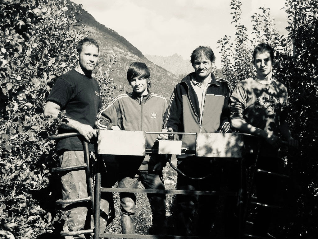 Michael Lanpacher (second from the right) was a farmer himself for over 30 years and enjoyed working in the fields with his two sons Johannes and Stephan. He was constantly looking for innovative solutions to make work in the fields easier. Over time, Michael recognized some areas in which the apple growers were unnecessarily losing time, quality and energy.