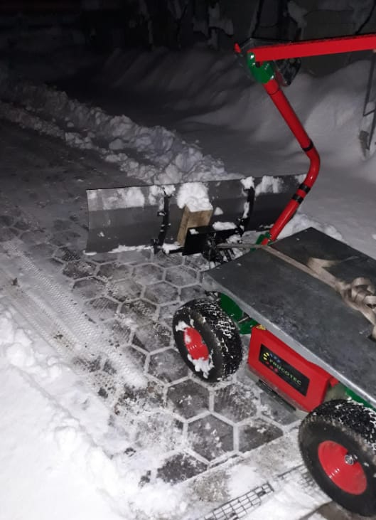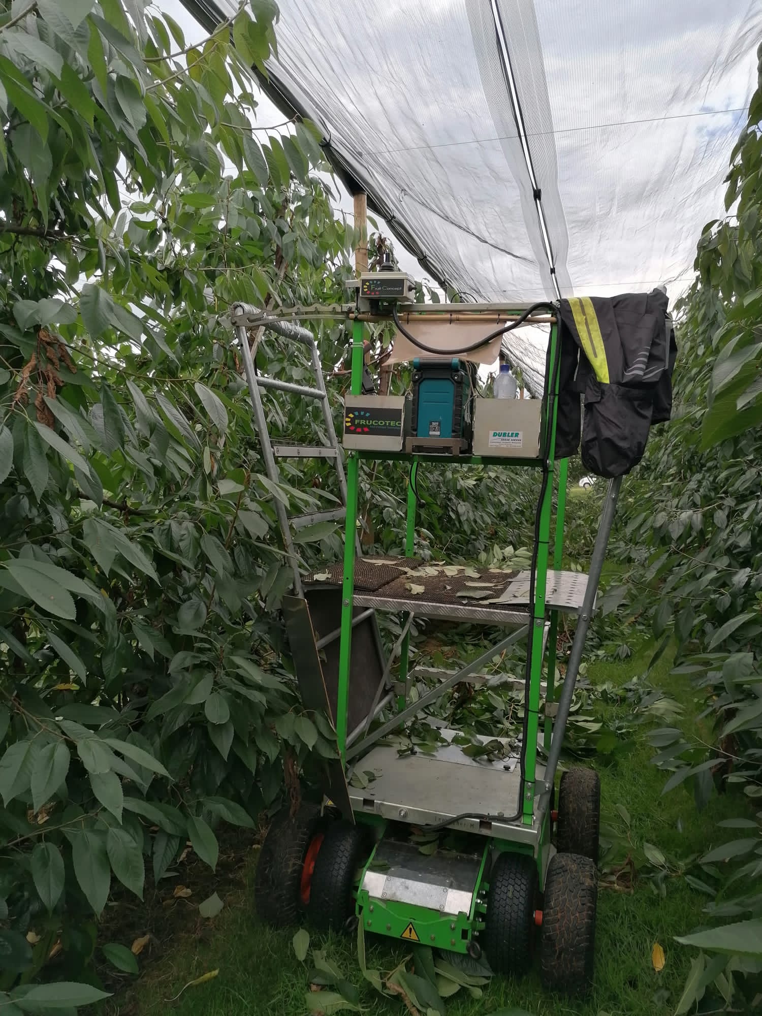 With the standard battery, you can usually operate the machine for a full day — except in rare cases, such as fast-paced hail net work. In those situations, we can upgrade to the maximum battery capacity to ensure you still complete a full day of work. Typically, you take the battery home, charge it overnight, and start fresh the next day.